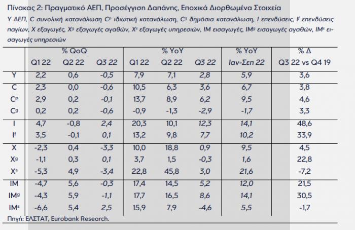Όπως σημειώνει η Eurobank, την Τετάρτη 7 Δεκεμβρίου 2022, η Ελληνική Στατιστική Αρχή (ΕΛΣΤΑΤ) ανακοίνωσε τους εθνικούς λογαριασμούς για το τρίτο τρίμηνο 2022. Η περίοδος Ιουλίου-Σεπτεμβρίου 2022 χαρακτηρίστηκε: