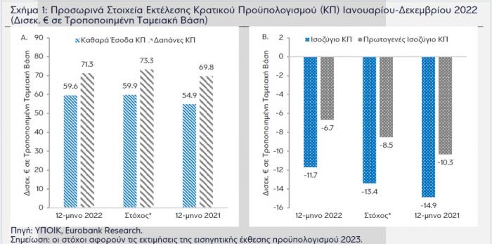 Αν και τα στοιχεία εκτέλεσης ΚΠ διαφέρουν μεθοδολογικά από τα δημοσιονομικά στοιχεία που δημοσιεύει η ΕΛΣΤΑΤ (τα μεν πρώτα είναι σε τροποποιημένη ταμειακή βάση τα δε δεύτερα σε δεδουλευμένη βάση, τα μεν πρώτα αφορούν ένα υποσύνολο της γενικής κυβέρνησης τα δε δεύτερα αφορούν το σύνολο της γενικής κυβέρνησης), τα προαναφερθέντα αποτελέσματα, παράλληλα με την υψηλή αύξηση του ονομαστικού ΑΕΠ, αποτελούν μια ισχυρή ένδειξη για σημαντική αποκλιμάκωση του ελλείμματος της γενικής κυβέρνησης ως ποσοστό του ΑΕΠ το 2022.