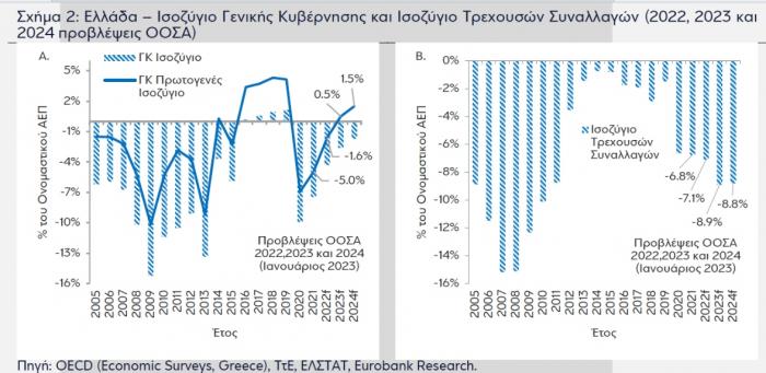 Σύμφωνα με την πρόσφατη έκθεση του Οργανισμού Οικονομικής Συνεργασίας και Ανάπτυξης (ΟΟΣΑ) για την ελληνική οικονομία, το έλλειμμα της γενικής κυβέρνησης ως ποσοστό του ΑΕΠ από 7,5% το 2021 προβλέπεται να μειωθεί στο 4,3% το 2022, στο 2,6% το 2023 και στο 1,7% το 2024. Το πρωτογενές αποτέλεσμα αναμένεται να παραμείνει σε έλλειμμα το 2022 (1,6% του ΑΕΠ από 5,0% το 2021, βλέπε Σχήμα 2Α) και στη συνέχεια να περάσει σε πλεόνασμα 0,5% το 2023 και 1,5% το 2024.