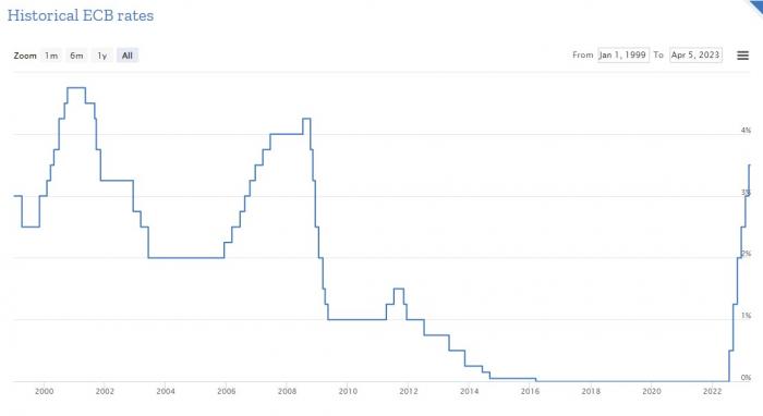 Μέχρι και τον Ιούνιο του 2022, το βασικό επιτόκιο αναχρηματοδότησης της ΕΚΤ ήταν μηδενικό και το επιτόκιο αποδοχής καταθέσεων αρνητικό, στο -0,50%. Από τον Ιούλιο του 2022 έχουν γίνει συνολικά έξι αυξήσεις, που έχουν αυξήσει στο 3,50% το βασικό επιτόκιο αναχρηματοδότησης και στο 3% το επιτόκιο αποδοχής καταθέσεων. Αυτή η αύξηση κατά 3,5 ποσοστιαίες μονάδες μέσα σε λιγότερο από ένα έτος ήταν η πιο «επιθετική» στην ιστορία της ΕΚΤ, που αντέδρασε στην άνοδο του πληθωρισμού στην ευρωζώνη σε διψήφια ποσοστά.