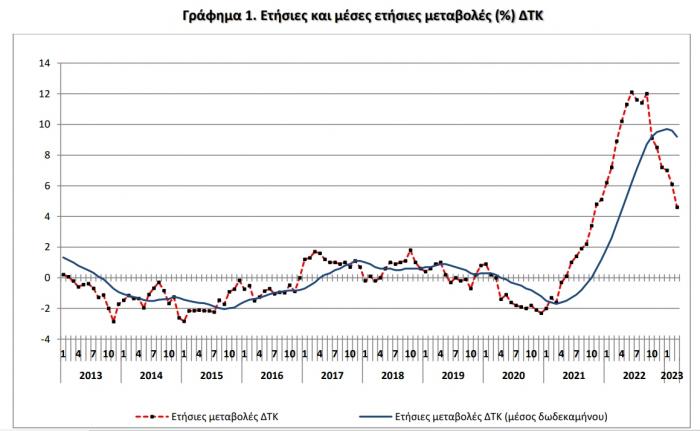 Ο μέσος ΔΤΚ του δωδεκαμήνου Απριλίου 2022 - Μαρτίου 2023, σε σύγκριση με τον αντίστοιχο Δείκτη του δωδεκαμήνου Απριλίου 2021 - Μαρτίου 2022, παρουσίασε αύξηση 9,2% έναντι αύξησης 3,5% που σημειώθηκε κατά την αντίστοιχη σύγκριση του δωδεκαμήνου Απριλίου 2021 - Μαρτίου 2022 με το δωδεκάμηνο Απριλίου 2020 - Μαρτίου 2021.