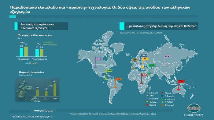 Ελαιόλαδο αλλά και «πράσινη» τεχνολογία ήταν τα δύο βασικά προϊόντα που στήριξαν τις ελληνικές εξαγωγές το 2022, όπως αναφέρει σε ανάλυσή της η Εθνική Τράπεζα, βασικό συμπέρασμα της οποίας είναι ότι, παρά την επιβράδυνση του τελευταίου τριμήνου και το μειωμένο εύρος της βάσης ανόδου, η σταθερά ισχυρή επίδοση των εξαγωγών υψηλής τεχνολογίας θέτει στέρεες βάσεις για περαιτέρω κέρδη στις διεθνείς αγορές την επόμενη τριετία.