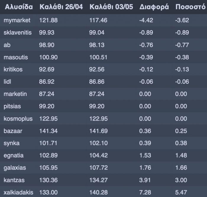 Επισυνάπτεται πίνακας με το κόστος του «Καλαθιού του Νοικοκυριού» ανά σούπερ μάρκετ και η μεταβολή του από την 26η στην 27η εβδομάδα.