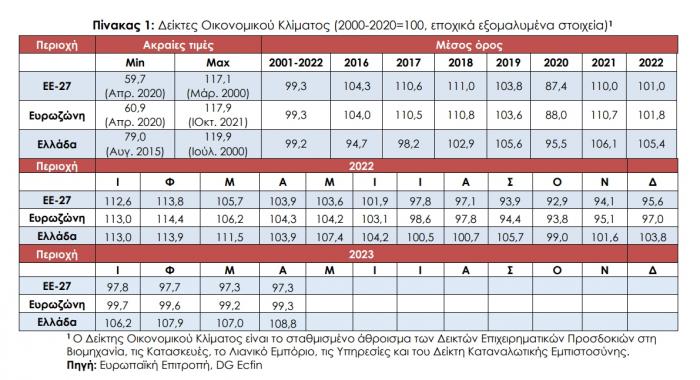 Ο δείκτης διαμορφώθηκε στις 108,8 μονάδες από 107 που ήταν τον προηγούμενο μήνα και στο υψηλότερο επίπεδο από τον Απρίλιο του 2022, καθώς καταγράφηκε βελτίωση των προσδοκιών στο λιανικό εμπόριο και τις υπηρεσίες, καθώς στους υπόλοιπους τομείς οι μεταβολές ήταν πτωτικές, ενώ και η καταναλωτική εμπιστοσύνη επιδεινώνεται.