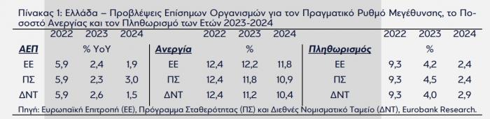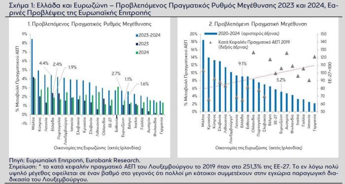 Όπως σημειώνουν οι αναλυτές της τράπεζας σύμφωνα με τις εαρινές προβλέψεις της Ευρωπαϊκής Επιτροπής (ΕΕπ), ο ετήσιος πραγματικός ρυθμός μεγέθυνσης της ελληνικής οικονομίας, δηλαδή η ετήσια ποσοστιαία μεταβολή του πραγματικού ΑΕΠ, αναμένεται να διαμορφωθεί στο 2,4% και στο 1,9% το 2023 και το 2024 αντίστοιχα (μέσος όρος 2,2% έναντι 1,3% στην Ευρωζώνη), από 5,9% το 2022.