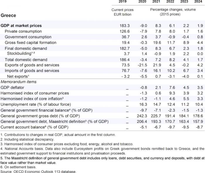 Διατήρηση του υγιούς ρυθμού ανάπτυξης για την ελληνική οικονομία τόσο το 2023 όσο και το 2024 προβλέπει ο ΟΟΣΑ, τον οποίο τοποθετεί στο 2,2% και 1,9% αντίστοιχα, εκτιμώντας ότι θα συνεχιστεί η καλή πορεία των επενδύσεων, ενώ εκτιμά ότι ο Εναρμονισμένος Δείκτης Τιμών Καταναλωτή θα υποχωρήσει στο 3,9% κατά το τρέχον έτος και στο 3,2% το 2024.
