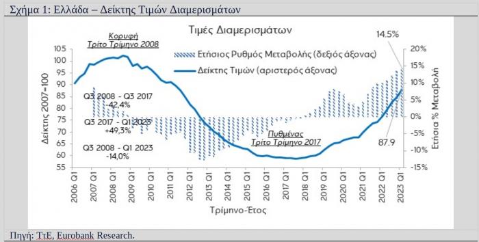 Η θετική πορεία της ελληνικής οικονομίας αποτελεί έναν από τους παράγοντες - κλειδιά για την ανοδική τροχιά στις τιμές των διαμερισμάτων σε όλη τη χώρα και ιδιαίτερα στις αστικές περιοχές, όπως τονίζει στην ανάλυσή της «7 Ημέρες Οικονομία» η Eurobank.