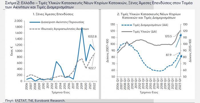 Επιπρόσθετα, οι αναμενόμενοι πόροι από το Ταμείο Ανάκαμψης και Ανθεκτικότητας (ΤΑΑ) και οι αναμενόμενες μεταρρυθμίσεις-επενδύσεις που το συνοδεύουν βελτίωσαν τις προοπτικές της οικονομίας. Τέλος, τα τελευταία πέντε χρόνια καταγράφεται απότομη άνοδος των κεφαλαίων από την αλλοδαπή που τοποθετούνται σε εγχώρια ακίνητα. Όπως παρουσιάζεται στο Σχήμα 2.1, οι ξένες άμεσες επενδύσεις στη διαχείριση ακίνητης περιουσίας από τα μόλις €69,5 εκατ. το 2017 ανήλθαν στα €1.032,8 εκατ. το 2022, ενώ οι ξένες άμεσες επενδύσεις στο πεδίο των ιδιωτικών αγοραπωλησιών ακίνητων από τα €327,8 εκατ. το 2017 διαμορφώθηκαν στα €922,7 εκατ. το 2022.