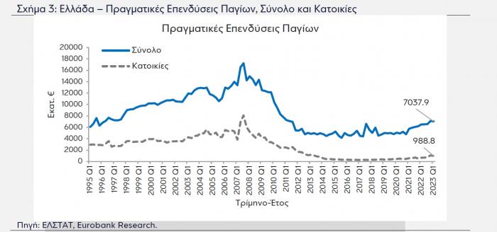 Στην πλευρά των παραγόντων που επηρεάζουν την προσφορά, σημειώνουμε τον μέχρι πρόσφατα χαμηλό ρυθμό επενδύσεων σε κατοικίες (βλέπε Σχήμα 3), τη ραγδαία αύξηση των τιμών υλικών (βλέπε Σχήμα 2.2) κατά σχεδόν 20% τα δύο τελευταία χρόνια, καθώς και τις πολλές δεσμευμένες κατοικίες που βρίσκονται εκτός αγοράς.