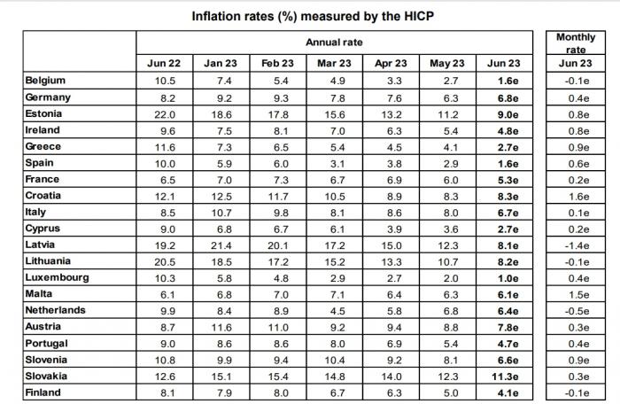 Πιο συγκεκριμένα και βάσει της πρώτης εκτίμησης της Eurostat o πληθωρισμός στη ζώνη του ευρώ υποχώρησε στο 5,5% για τον Ιούνιο από 6,1% που ήταν τον προηγούμενο μήνα. Ο δομικός δείκτης (εκτός ενέργειας και τροφίμων) διαμορφώθηκε στο 6,8% από 6,9% που ήταν τον Μάιο.