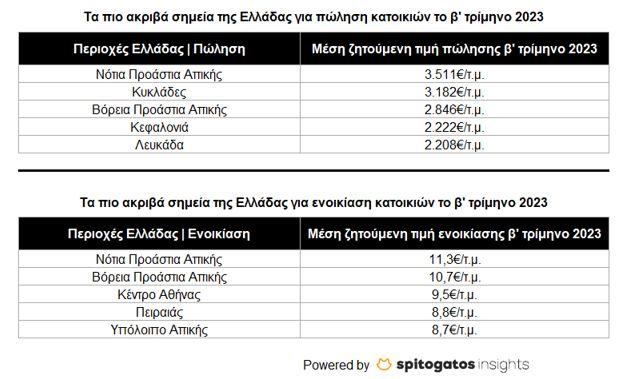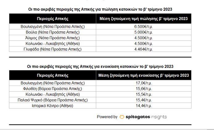 Η ανοδική τάση των τιμών ως προς τις κατοικίες που διατίθενται προς πώληση και ενοικίαση συνεχίζεται και το δεύτερο τρίμηνο του 2023, συγκριτικά με το αντίστοιχο διάστημα του 2022. Κάποιες από τις περιοχές που παρουσίασαν τις μεγαλύτερες αυξήσεις στις μέσες ζητούμενες τιμές πώλησης σε σχέση με πέρσι είναι το Ίλιον (Δυτικά Προάστια) με αύξηση +32%, η Αγία Παρασκευή (Βόρεια Προάστια) με αύξηση +27%, η περιοχή Ζωγράφου (Νότια Προάστια) με αύξηση +26% και η Καλλιθέα (Νότια Προάστια) με αύξηση +23%.