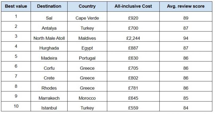 Στην ετήσια ανάλυσή της, η βρετανική Savoo ανέλυσε το κόστος των διακοπών all inclusive ανά άτομο, συγκρίνοντας 41 δημοφιλείς προορισμούς διεθνώς, ώστε να προσδιορίσει αυτούς που προσφέρουν μεγαλύτερη αξία στους επισκέπτες.