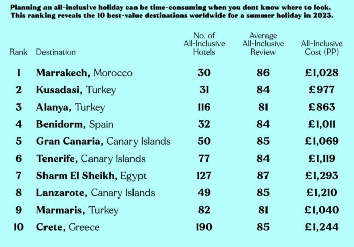 Τα αποτελέσματα για το 2023 δείχνουν ότι μόνο η Κρήτη τοποθετείται στους δέκα κορυφαίους προορισμούς, καθώς κατατάσσεται στη 10η θέση ως ο πιο συμφέρων all inclusive προορισμός της Ελλάδας, με μέσο όρο αξιολογήσεων 85/100 και συνολικό κόστος που αγγίζει τις 1.244 λίρες.