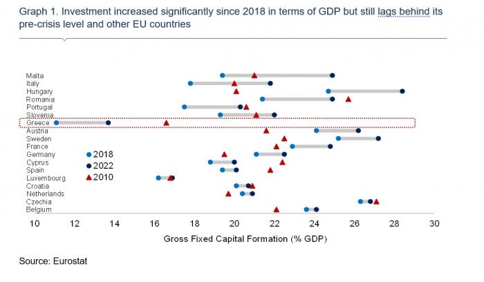 Οι μεταρρυθμίσεις που υιοθετήθηκαν στις αγορές προϊόντων και εργασίας, σε συνδυασμό με τη σταδιακή επιστροφή στη δημοσιονομική πειθαρχία και την ενίσχυση της βιωσιμότητας του χρέους, καθώς και η ενίσχυση της ανταγωνιστικότητας που καταγράφηκε τα τελευταία έτη, οδήγησαν σε θετικό αναπτυξιακό αποτύπωμα από το 2017 και μετά. Αν και αυτή η μεγέθυνση της οικονομικής δραστηριότητας προήλθε κυρίως από την ιδιωτική κατανάλωση, η συμβολή των επενδύσεων στην μεγέθυνση του ΑΕΠ αυξάνεται σταδιακά, ιδίως τα τελευταία δύο χρόνια. Ωστόσο, το μερίδιο των επενδύσεων στο ΑΕΠ παραμένει πολύ χαμηλότερο από το επίπεδό του πριν από το ξέσπασμα της κρίσης στο τέλος της προηγούμενης δεκαετίας. Όπως απεικονίζεται στο Γράφημα 1, παρά το γεγονός ότι η Ελλάδα συγκαταλέγεται στις 7 χώρες της ΕΕ με τη μεγαλύτερη αύξηση των επενδύσεων ως ποσοστό του ΑΕΠ, μεταξύ 2018-2022 (από 11,1% σε 13,7%), εντούτοις, το ποσοστό αυτό παραμένει το χαμηλότερο στην ΕΕ και πολύ χαμηλότερο από τα προ κρίσης επίπεδα (2010: 16,6%).