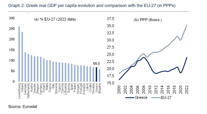 Οι επενδύσεις παραμένουν βασική προϋπόθεση για βιώσιμη οικονομική μεγέθυνση. Ένα μοντέλο μεγέθυνσης που βασίζεται περισσότερο στις επενδύσεις σε σύγκριση με το παρελθόν αναμένεται να επιταχύνει την οικονομική σύγκλιση με την Ευρωπαϊκή Ένωση. Το κατά κεφαλήν ΑΕΠ της Ελλάδας υστερεί σε σχέση με τα μέλη της ΕΕ. Όπως απεικονίζεται στο Γράφημα 2α, ο βαθμός σύγκλισης με τον ευρωπαϊκό μέσο όρο, δηλαδή το κατά κεφαλήν ΑΕΠ της Ελλάδας ως ποσοστό του μέσου όρου της ΕΕ, ήταν το 2022 μεταξύ των δύο τελευταίων στην ΕΕ-27, πάνω από αυτόν της Βουλγαρίας. Παρά το γεγονός ότι το κατά κεφαλήν ΑΕΠ αυξήθηκε κατά 15% το 2022 (με βάση τις ισοτιμίες αγοραστικής δύναμης), ανακάμπτοντας στο επίπεδο του 2008, έτος έναρξης της παγκόσμιας χρηματοπιστωτικής κρίσης, το ποσοστό σύγκλισης ανήλθε σε 68%, ενώ το 2002 το κατά κεφαλήν ΑΕΠ της Ελλάδας ήταν ίσο με το 93,3% του μέσου όρου της ΕΕ-27 (Γράφημα 2β).
