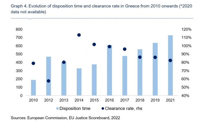 Η Ελλάδα συγκαταλέγεται στην ομάδα των χωρών της ΕΕ που παρουσιάζουν χαμηλές επιδόσεις στον τομέα της δικαιοσύνης (τελευταία διαθέσιμα στοιχεία: 2021, Γράφημα 3), με σχετικά χαμηλό ποσοστό επίλυσης υποθέσεων (clearance rate) κάτω από τον αντίστοιχο μέσο όρο της ΕΕ (82,4%, έναντι 100%) και υψηλό χρόνο απονομής δικαιοσύνης (728 ημέρες), ο οποίος είναι ο υψηλότερος μεταξύ των χωρών της ΕΕ. Εξετάζοντας την διαχρονική εξέλιξη αυτών των δεικτών για την Ελλάδα (Γράφημα 4), μπορεί κανείς να παρατηρήσει ότι ο χρόνος που απαιτείται για την επίλυση αστικών και εμπορικών διαφορών σε πρώτο βαθμό στην Ελλάδα σταδιακά επιδεινώθηκε από το 2014 (330 ημέρες) και μετά, καθώς αυξήθηκε σε 728 ημέρες το 2021, από 637 ημέρες το 2019 και 559 ημέρες το 2018. Ομοίως, το ποσοστό επίλυσης υποθέσεων επιδεινώθηκε ελαφρώς το 2021, ανερχόμενο σε 82,4% (με τις εκδικασθείσες υποθέσεις να ανέρχονται σε 177.813 και τις εισερχόμενες υποθέσεις σε 206.387) σε σύγκριση με 86,2% το 2019 και 86,3% το 2018, υψηλότερο από τα επίπεδα του 2010 (78,9%), αλλά κάτω από τα επίπεδα του 2014 (113,1%).