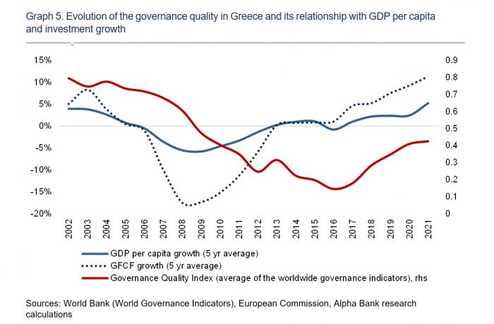 Η θετική σχέση μεταξύ οικονομικής ανάπτυξης και επενδύσεων και της βελτίωσης της ποιότητας διακυβέρνησης απεικονίζεται στο Γράφημα 5, το οποίο περιλαμβάνει τον δείκτη ποιότητας διακυβέρνησης, τις επενδύσεις (ακαθάριστος σχηματισμός παγίου κεφαλαίου) και τους ρυθμούς αύξησης του κατά κεφαλήν ΑΕΠ.