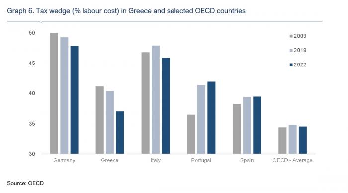 Η φορολογική επιβάρυνση για έναν άγαμο χωρίς παιδιά, με εισόδημα στο 100% των μέσων αποδοχών στην Ελλάδα, ανέρχεται σήμερα στο 37,1% επί του κόστους εργασίας ανά απασχολούμενο (στοιχεία 2022). Η μείωση που καταγράφηκε τα τελευταία χρόνια, ήταν η δεύτερη υψηλότερη μεταξύ των χωρών του ΟΟΣΑ (από 40,4% το 2019), ενώ σε σύγκριση με το 2009, η φορολογική επιβάρυνση της εργασίας μειώθηκε σωρευτικά κατά 4,1 π.μ. Ως αποτέλεσμα, αν και το μη μισθολογικό κόστος εργασίας στην Ελλάδα παραμένει πάνω από τον μέσο όρο του ΟΟΣΑ, ήταν το 2022 το χαμηλότερο ποσοστό που έχει καταγραφεί από το 2000 και μικρότερο σε σύγκριση με άλλες ευρωπαϊκές χώρες, όπως η Ισπανία και η Πορτογαλία (Γράφημα 6).