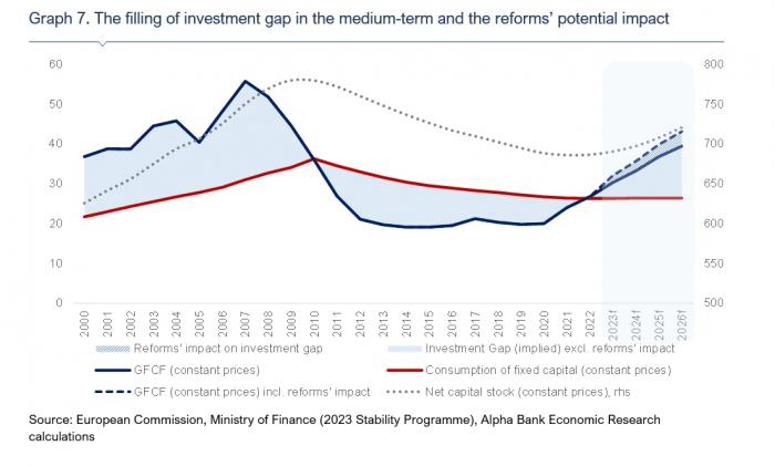 Σημειώνουν ακόμη ότι η μακροχρόνια ύφεση της προηγούμενης δεκαετίας οδήγησε σε σημαντική απομείωση του κεφαλαιακού αποθέματος της χώρας δημιουργώντας ένα επενδυτικό κενό καθώς οι αποσβέσεις παρέμειναν υψηλότερες από τον σχηματισμό παγίου κεφαλαίου για μια παρατεταμένη περίοδο, από το 2010 έως το 2021. Η αποεπένδυση της περιόδου αυτής, καθυστέρησε την υιοθέτηση νέων τεχνολογιών, οδηγώντας σε μείωση της παραγωγικότητας, καθώς η εργασία συνδυαζόταν με κεφάλαιο χαμηλότερης ποιότητας. Το επενδυτικό κενό που ορίζεται ως η «διάβρωση» του αποθέματος φυσικού κεφαλαίου της χώρας κατά την περίοδο που οι αποσβέσεις υπερέβησαν τις νέες επενδύσεις εκτιμάται περί τα €95 δισ. σε τρέχουσες τιμές.