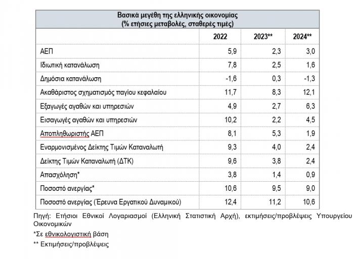 Σε αυτό το δυσμενές και αβέβαιο διεθνές περιβάλλον, η ελληνική οικονομία αποδεικνύεται ανθεκτική. Ο ρυθμός ανάπτυξης παραμένει στους στόχους που έχουν τεθεί στο Πρόγραμμα Σταθερότητας του Απριλίου 2023 και αναμένεται να ανέλθει σε 2,3% το 2023 και 3% το 2024. Το Ακαθάριστο Εγχώριο Προϊόν (ΑΕΠ) σε ονομαστικούς όρους αναμένεται να αυξηθεί από 208 δισ. ευρώ το 2022 σε 224 δισ. ευρώ το 2023 και 235 δισ. ευρώ το 2024. Παράλληλα, ο Εναρμονισμένος Δείκτης Τιμών Καταναλωτή αναμένεται να κυμανθεί σε ελαφρώς χαμηλότερα επίπεδα και να διαμορφωθεί σε 4% έναντι 4,5% που προβλεπόταν στο Πρόγραμμα Σταθερότητας για το 2023 και να αποκλιμακωθεί περαιτέρω σε 2,4% για το 2024. Οι επενδύσεις αναμένεται να αυξηθούν κατά 8,3% κατά το τρέχον έτος και ακόμη περισσότερο κατά 12,1% το 2024, ενώ η ανεργία αναμένεται να μειωθεί από 11,2% το 2023 σε 10,6% το 2024.