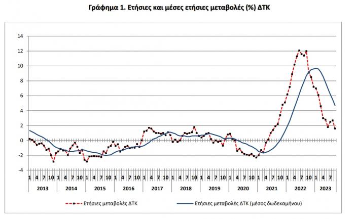 - Ο μέσος ΔΤΚ του δωδεκαμήνου Οκτωβρίου 2022 - Σεπτεμβρίου 2023, σε σύγκριση με τον αντίστοιχο Δείκτη του δωδεκαμήνου Οκτωβρίου 2021 - Σεπτεμβρίου 2022, παρουσίασε αύξηση 4,7% έναντι αύξησης 8,7% που σημειώθηκε κατά την αντίστοιχη σύγκριση του δωδεκαμήνου Οκτωβρίου 2021 - Σεπτεμβρίου 2022 με το δωδεκάμηνο Οκτωβρίου 2020 - Σεπτεμβρίου 2021