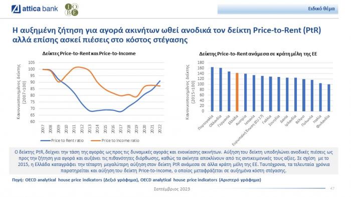 Oι δείκτες Price-to-Rent και Price-to-Income καταγράφουν ανάκαμψη, υποδεικνύοντας αυξημένη ζήτηση για αγορά ακινήτων, αλλά και ολοένα υψηλότερο κόστος κάλυψης βασικών αναγκών στέγασης.