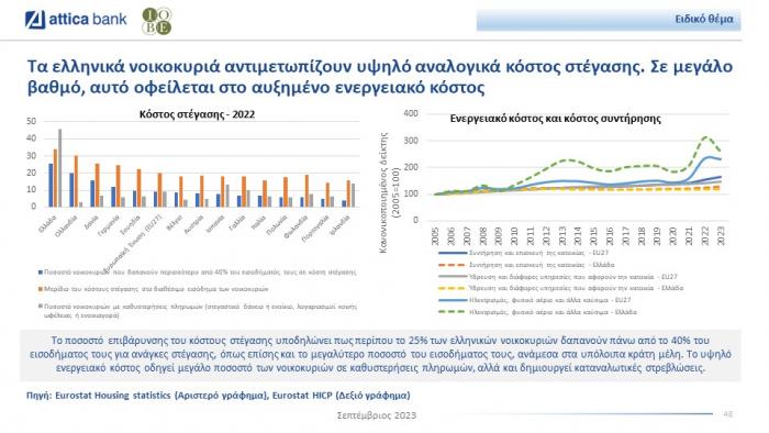 Το υψηλό κόστος στέγασης, το οποίο συνοδεύεται από τα υψηλά επίπεδα πληθωρισμού και την επακόλουθη αύξηση των επιτοκίων δανεισμού με σκοπό την επιστροφή του πληθωρισμού σε φυσιολογικά επίπεδα, δημιουργεί προκλήσεις όχι μόνο στην δαπάνη των νοικοκυριών, αλλά και στην αποπληρωμή ενυπόθηκων δανείων και στη ζήτηση νέων δανείων. Περίπου το 25% των ελληνικών νοικοκυριών δαπανούν πάνω από το 40% του εισοδήματος τους για ανάγκες στέγασης, όπως επίσης και το μεγαλύτερο ποσοστό του εισοδήματος τους, ανάμεσα στα υπόλοιπα κράτη μέλη. Το υψηλό ενεργειακό κόστος οδηγεί μεγάλο ποσοστό των νοικοκυριών σε καθυστερήσεις πληρωμών, αλλά και δημιουργεί καταναλωτικές στρεβλώσεις.