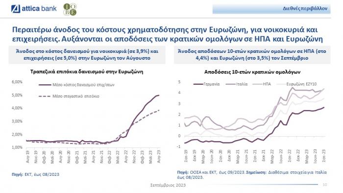 Η παγκόσμια οικονομική δραστηριότητα συνεχίζει να επιβραδύνεται, ενώ o ρυθμός πληθωρισμού κάμπτεται με αργό ρυθμό. Οι βραχυπρόθεσμες προοπτικές για την ευρωπαϊκή οικονομία επιδεινώνονται, με τη γερμανική οικονομία να αντιμετωπίζει πλέον τον κίνδυνο ύφεσης, ενώ η διάρκεια του πολέμου στην Ουκρανία και η μεταβλητότητα των διεθνών τιμών ενέργειας αποτελούν εστίες αβεβαιότητας, σύμφωνα με το Attica Economic Review Σεπτεμβρίου 2023 με τίτλο ««Ανθεκτικός ρυθμός ανάκαμψης υπό τη σκιά επιδείνωσης στο διεθνές περιβάλλον», το οποίο συντάσσεται από την Attica Bank σε συνεργασία με το ΙΟΒΕ. Το υψηλότερο κόστος χρήματος δρα ανασταλτικά στα καταναλωτικά και επενδυτικά σχέδια νοικοκυριών και επιχειρήσεων.