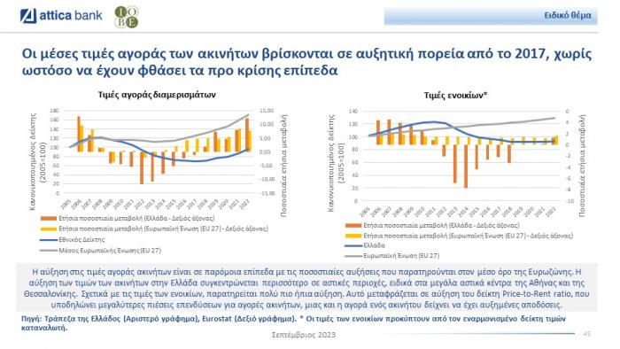 Η αύξηση στις τιμές αγοράς ακινήτων είναι σε παρόμοια επίπεδα με τις ποσοστιαίες αυξήσεις που παρατηρούνται στον μέσο όρο της Ευρωζώνης. Η αύξηση των τιμών των ακινήτων στην Ελλάδα συγκεντρώνεται περισσότερο σε αστικές περιοχές, ειδικά στα μεγάλα αστικά κέντρα της Αθήνας και της Θεσσαλονίκης. Σχετικά με τις τιμές των ενοικίων, παρατηρείται πολύ πιο ήπια αύξηση. Αυτό μεταφράζεται σε αύξηση του δείκτη Price-to-Rent, που υποδηλώνει μεγαλύτερες πιέσεις επενδύσεων για αγορές ακινήτων, μιας και η αγορά ενός ακινήτου δείχνει να έχει αυξημένες αποδόσεις.