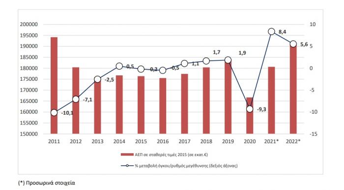 Στο παρακάτω διάγραμμα παρουσιάζεται το ΑΕΠ σε σταθερές τιμές έτους 2015, καθώς και οι αντίστοιχοι ρυθμοί μεγέθυνσης.