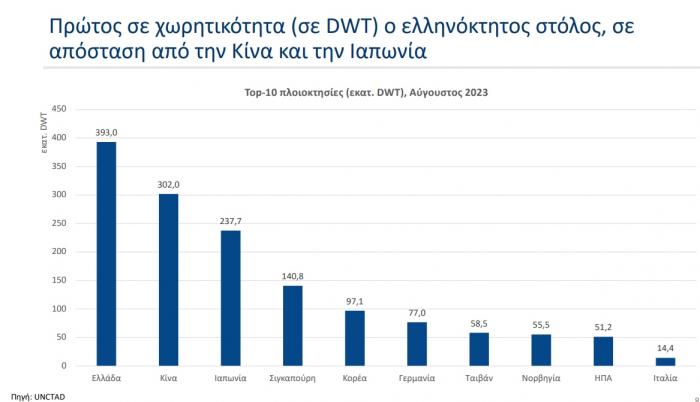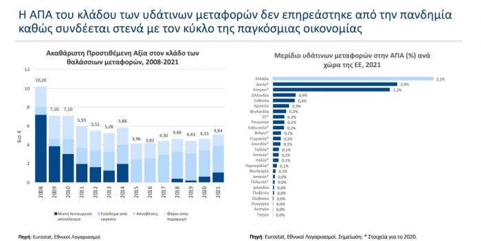 Σε όρους συμμετοχής στα μεγέθη της ελληνικής οικονομίας και παρά τη διατάραξη της δραστηριότητας κατά τη διάρκεια της πανδημίας COVID-19, η ναυτιλία εξακολουθεί να έχει με διαφορά το μεγαλύτερο μερίδιο στην ακαθάριστη προστιθέμενη αξία (ΑΠΑ) της ελληνικής οικονομίας σε σχέση με άλλα ευρωπαϊκά κράτη μέλη (3,1%, έναντι μόλις 0,2% κατά μέσο όρο στην ΕΕ). Επιπλέον, τα έσοδα από μεταφορικές υπηρεσίες σε χώρες του εξωτερικού, που καταγράφονται ως μέρος του διαχρονικά πλεονασματικού θαλάσσιου ισοζυγίου, παραμένουν σε υψηλά επίπεδα. Tην τελευταία δεκαετία (2012-2022), η χώρα εισέπραξε €148,3 δισεκ. από θαλάσσιες μεταφορές στο εξωτερικό, ποσό που αντιστοιχεί στο 42% του ακαθάριστου χρέους της γενικής κυβέρνησης.