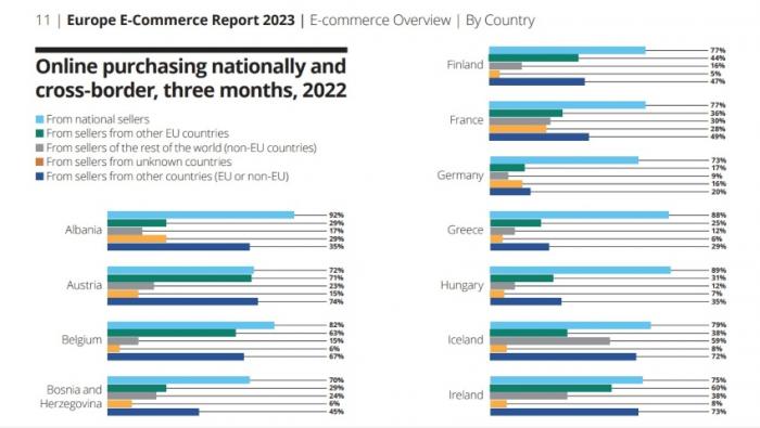 Αντίστοιχα το 81% των Ευρωπαίων καταναλωτών αγοράζουν από e-shop της χώρας τους, και 31% από άλλες χώρες της ΕΕ. Το 19% έχει ψωνίσει από ηλεκτρονικά καταστήματα εκτός ΕΕ ενώ το 15% από άγνωστες χώρες και το 37% από e-shop εντός και εκτός ΕΕ.