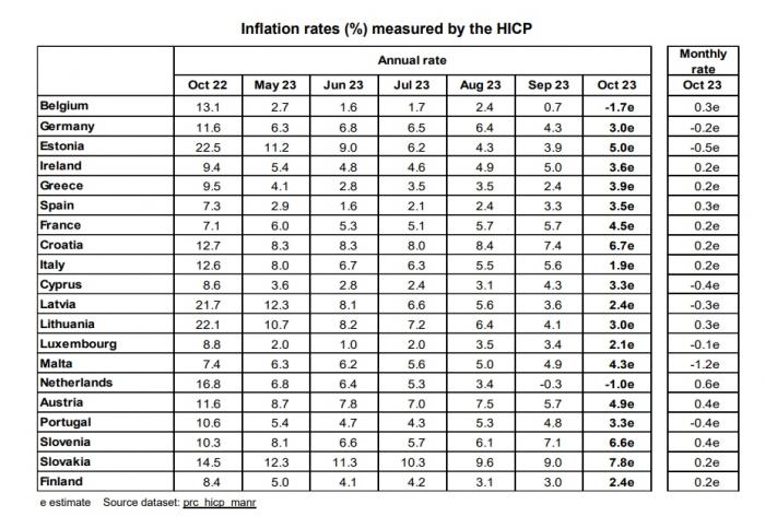 Ο πληθωρισμός μειώθηκε κυρίως λόγω των τιμών της ενέργειας, οι οποίες ήταν περίπου 11% χαμηλότερες μετά τις περσινές εξάρσεις εν μέσω της κρίσης Ρωσίας-Ουκρανίας και των συνεπακόλουθων ελλείψεων στην προμήθεια φυσικού αερίου. Τον προηγούμενο μήνα, οι τιμές της ενέργειας είχαν μειωθεί κατά 4,6% σε ετήσια βάση. Ο πληθωρισμός των τροφίμων συνέχισε επίσης να υποχωρεί, φθάνοντας στο 7,5% τον Οκτώβριο από 8,8% τον προηγούμενο μήνα.