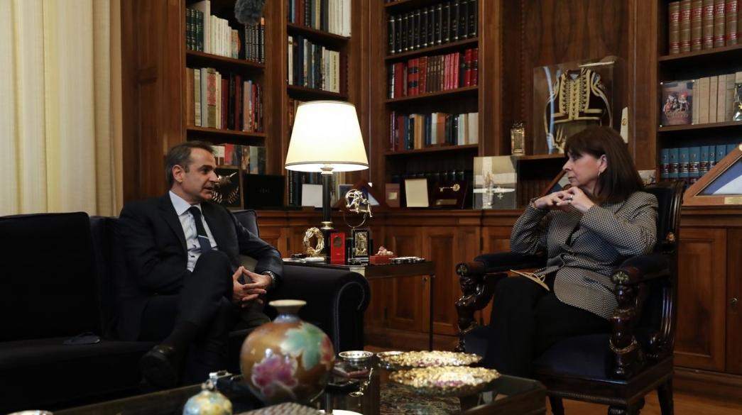 «Να σας ευχαριστήσω για την πενταετή προσφορά σας στην πατρίδα. Έχετε αφήσει το δικό σας ξεχωριστό αποτύπωμα», είπε ο πρωθυπουργός κατά την τελευταία συνάντησή του με την Κατερίνα Σακελλαροπούλου. «Η εκλογή του νέου προέδρου έγινε με όλες τις προβλεπόμενες από το Σύνταγμα διατάξεις», συνέχισε ο πρωθυπουργός.