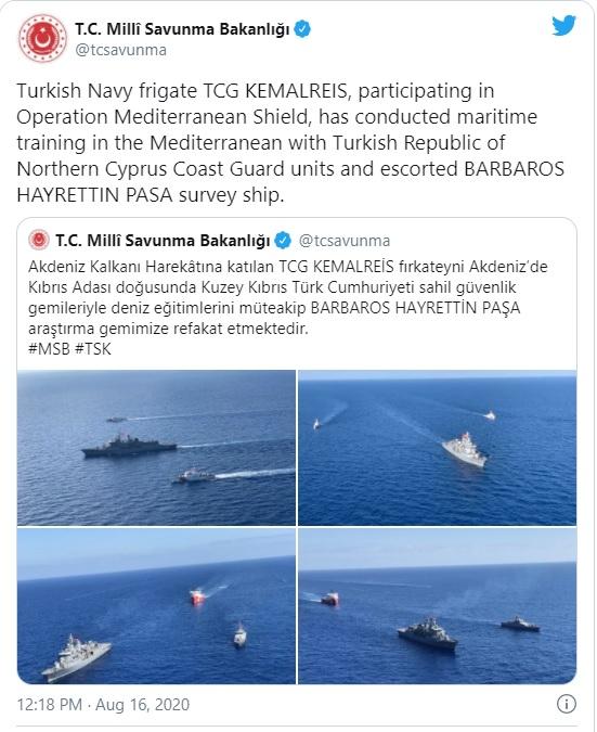 Νωρίτερα, πληροφορές ανέφεραν ότι η φρεγάτα «Kemal Reis», η οποία ενεπλάκει στο «ατύχημα» με τη φρεγάτα του Πολεμικού Ναυτικού «Λήμνος», αποχώρησε εχθές από την περιοχή που πλέει το Oruc Reis. Η ελληνική φρεγάτα έκανε ελιγμούς για να αποφύγει τη μετωπική σύγκρουση και στη διαδικασία αυτή η πλήρω άγγιξε το πίσω μέρος της τουρκικής φρεγάτας, ανέφερε στο Reuters για το περιστατικό πηγή του ελληνικού υπουργείου Άμυνας.