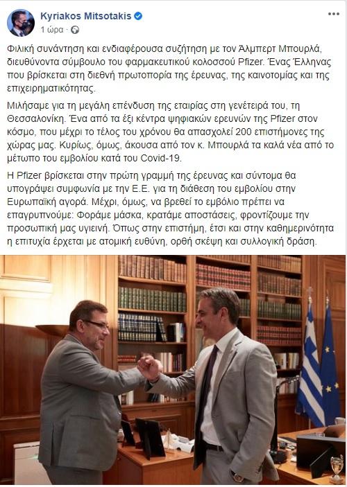 Ο πρωθυπουργός επισημαίνει ακόμη ότι στο πλαίσιο της συνάντησής τους μίλησαν «για τη μεγάλη επένδυση της εταιρίας στη γενέτειρά του, τη Θεσσαλονίκη. Ένα από τα έξι κέντρα ψηφιακών ερευνών της Pfizer στον κόσμο, που μέχρι το τέλος του χρόνου θα απασχολεί 200 επιστήμονες της χώρας μας».