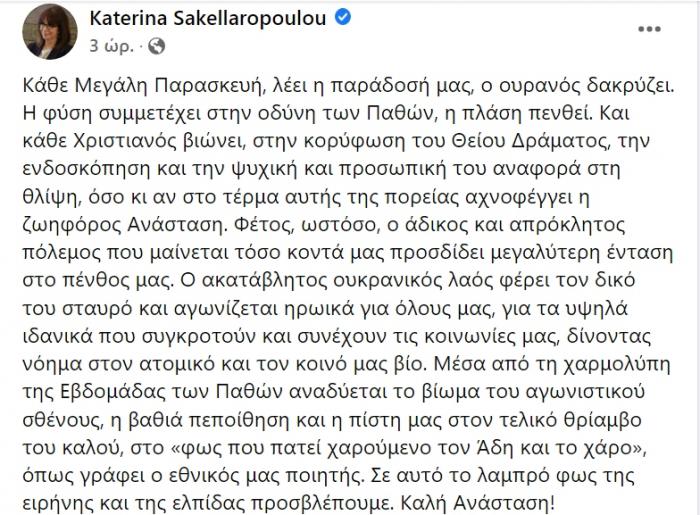 Όπως επισημαίνει η Πρόεδρος: «Κάθε Μεγάλη Παρασκευή, λέει η παράδοσή μας, ο ουρανός δακρύζει. Η φύση συμμετέχει στην οδύνη των Παθών, η πλάση πενθεί. Και κάθε Χριστιανός βιώνει, στην κορύφωση του Θείου Δράματος, την ενδοσκόπηση και την ψυχική και προσωπική του αναφορά στη θλίψη, όσο κι αν στο τέρμα αυτής της πορείας αχνοφέγγει η ζωηφόρος Ανάσταση. Φέτος, ωστόσο, ο άδικος και απρόκλητος πόλεμος που μαίνεται τόσο κοντά μας προσδίδει μεγαλύτερη ένταση στο πένθος μας.