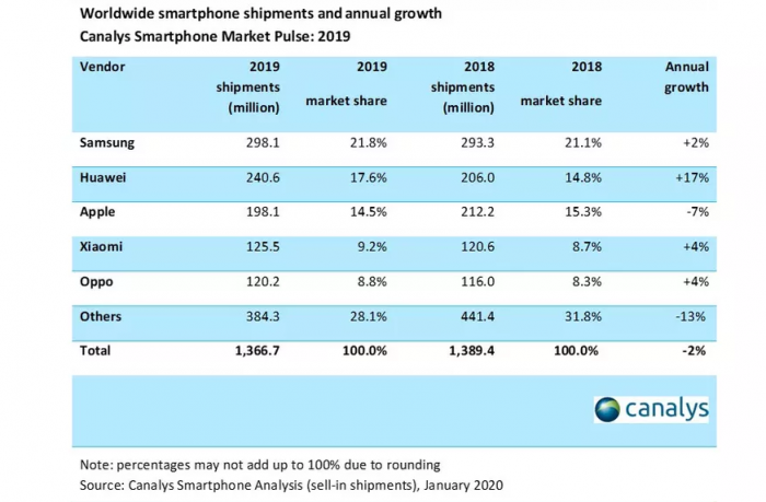 Κατά την διάρκεια της χρονιάς ο κινεζικός κολοσσός πούλησε 240 εκατ. συσκευές αφήνοντας πίσω την Apple που πούλησε 198,1 εκατ. συσκευές. Η Samsung, που είδε να χάνει την μάχη της εορταστικής περιόδου, διατηρήθηκε άνετα στην πρώτη θέση, καθώς πούλησε 298,1 εκατ συσκευές με την Xiaomi και την Oppo να συμπληρώνουν την πρώτη πεντάδα.