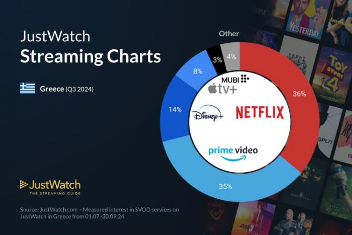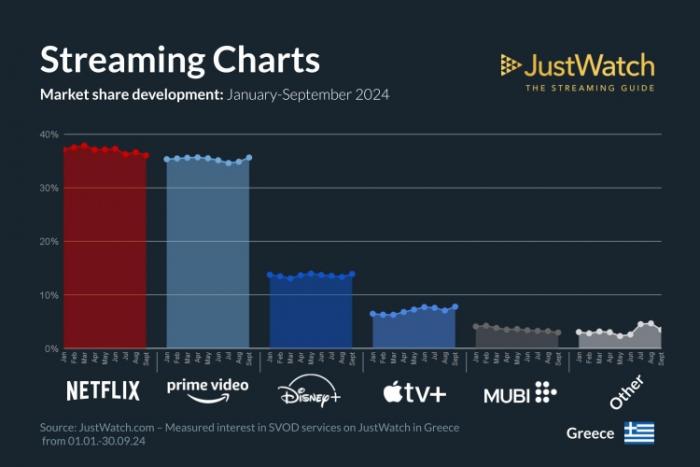 Σύμφωνα με τα στοιχεία του Just Watch, στο τρίτο τρίμηνο του 2024, Netflix και Amazon Prime Video διατήρησαν τις δύο πρώτες θέσεις αντίστοιχα στην ελληνική αγορά streaming, με το Disney+ να ακολουθεί έχοντας ανεβάσει ρυθμούς, ενώ πιο πίσω βρίσκεται η Apple TV και η Mubi.