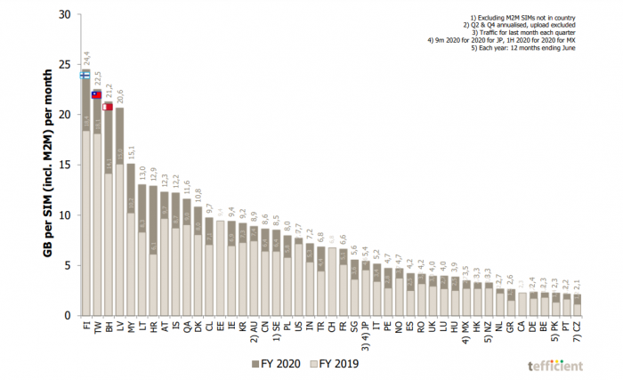 Πρώτη στην χρήση δεδομένων κινητής βρίσκεται η Φινλανδία όπου η μηνιαία κατανάλωση δεδομένων κινητής φτάνει τα 24,4 GB, όπου στα τέλη του 2020, το 68% των καρτών SIM είχαν πακέτο απεριόριστων data με την έκθεση της Tefficient να σημειώνει πως καμία άλλη χώρα δεν έχει τόσο υψηλά ποσοστά απεριόριστων δεδομένων. Μετά την Φινλανδία, στη χρήση δεδομένων κινητής ακολουθεί η Ταΐβάν με την μηνιαία χρήση να είναι στα 22,5 GB ενώ η τάση παραμένει αυξητική. Σύμφωνα με την έκθεση, οι 5 πάροχοι στη Ταΐβάν προσπάθησαν να μειώσουν την χρήση, αυξάνοντας τις τιμές των πακέτων απεριόριστων data, ωστόσο δεν η αγορά δεν δείχνει σημάδια επιβράδυνσης. Στην κατάταξη ακολουθούν Μπαχρέιν με 21,2 GB data μηνιαίως και η Λετονία με 20,6 GB, ενώ την πεντάδα κλείνει η Μαλαισία με 15,1 GB data να καταναλώνεται μηνιαίως.