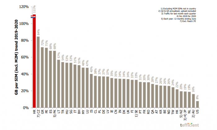 Σύμφωνα με έρευνα της Tefficient, παρά το γεγονός ότι στην Ελλάδα καταγράφηκε η τρίτη μεγαλύτερη άνοδος χρήσης δεδομένων με αύξηση 72%, η χώρα μας βρίσκεται στα χαμηλά στρώματα της κατάταξης καθώς είναι στην 39η θέση ανάμεσα σε 44 χώρες, με την μηνιαία χρήση data ανά κάρτα SIM να φτάνει τα 2,6 GB έναντι 1,5 GB που ήταν το 2019.  Μεγαλύτερη αύξηση στη χρήση δεδομένων από την Ελλάδα, κατέγραψε η Κροατία με άνοδο 111% και η Τσεχία με 84%.