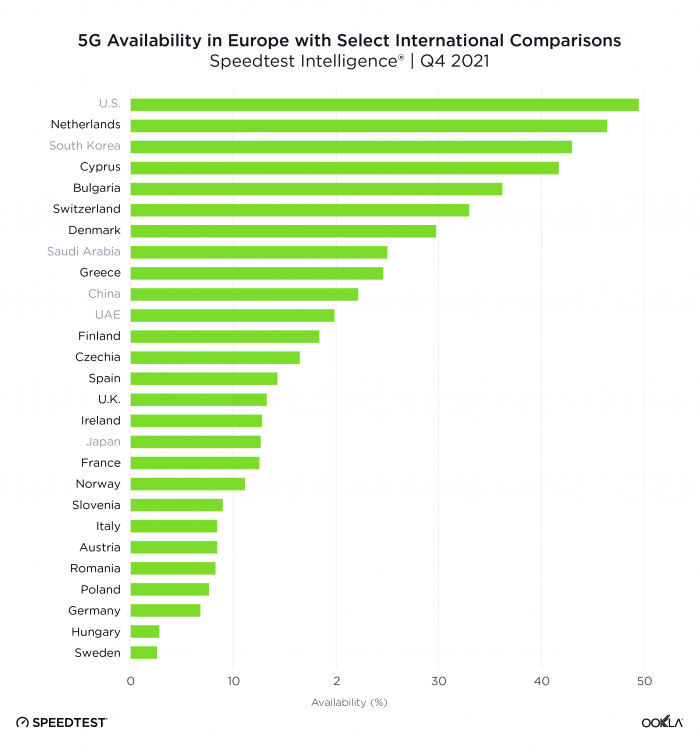 Κάτι που έχει σαν αποτέλεσμα να βρίσκεται στην πρώτη 10αδα παγκοσμίως η Ελλάδα και στη διαθεσιμότητα του δικτύου 5G που αντιπροσωπεύει το ποσοστό των χρηστών 5G συσκευών που περνούν τον περισσότερο χρόνο τους συνδεδεμένοι σε 5G δίκτυο. Οι ΗΠΑ έχοντας 5G δίκτυο τα τελευταία τρία χρόνια και μια τεράστια δεξαμενή χρηστών συσκευών 5G βρίσκονται στην πρώτη θέση της παγκόσμιας κατάταξης με ποσοστό που πλησιάζει το 50% με την Ολλανδία, τη Νότια Κορέα, την Κύπρο και την Βουλγαρία να συμπληρώνουν την κορυφαία πεντάδα ενώ η χώρα μας με ποσοστό κοντά στο 25% βρίσκεται στην 9η θέση της παγκόσμιας κατάταξης.