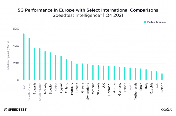 Σύμφωνα με τα στοιχεία της Ookla, η ταχύτητα του δικτύου 5G στην Ελλάδα στο τέταρτο τρίμηνο του 2021 βρίσκεται στην 7η θέση της ευρωπαϊκής κατάταξης και 12η παγκοσμίως, με τη μέση ταχύτητα download να είναι στα 200 Mbps. Είναι χαρακτηριστικό πως οι ταχύτητες που πιάνουν τα δίκτυα 5G στην Ελλάδα αν και βρίσκονται πίσω από Βουλγαρία, Σουηδία και Νορβηγία που φτάνουν ή ξεπερνούν τα 300 Mbps, κατατάσσουν τη χώρα μας πάνω από χώρες όπως η Ρουμανία, η Βρετανία ή ακόμα και οι ΗΠΑ. Την παγκόσμια πρωτιά κατέχουν ωστόσο τα Ηνωμένα Αραβικά Εμιράτα και ακολουθεί η Νότια Κορέα με την Βουλγαρία στην τρίτη θέση και την Σαουδική Αραβία στην τέταρτη.