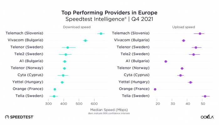 Ωστόσο οι πάροχοι στην Ελλάδα έχουν ακόμα αρκετό δρόμο να καλύψουν σε σχέση με τον ευρωπαϊκό ανταγωνισμό, καθώς καμία από τις εταιρείες που δραστηριοποιείται στη χώρα μας δεν έχει καταφέρει να πλησιάσει τις ταχύτητες που υπάρχουν στην Ευρώπη. Ειδικότερα, η Telemach στη Σλοβενία πιάνει ταχύτητες που ξεπερνούν τα 600 Mbps στο download με την Vivacom στη Βουλγαρία να ακολουθεί στα 500 Mbps ενώ στην 7η θέση βρίσκουμε την κυπριακή Cyta με ταχύτητες που κυμαίνονται πέριξ των 400 Mbps.