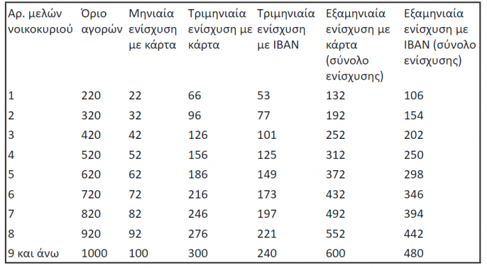 Η ενίσχυση ανέρχεται σε 10% επί του ύψους των αγορών ειδών κάθε είδους από τα καταστήματα που δραστηριοποιούνται στο λιανικό εμπόριο τροφίμων και έως τα ακόλουθα όρια που διαμορφώνονται ανάλογα με τη σύνθεση του νοικοκυριού.