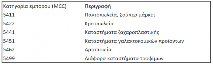 Το πιστωθέν χρηματικό ποσό στη ψηφιακή χρεωστική κάρτα δύναται να χρησιμοποιείται από τον δικαιούχο για την πραγματοποίηση αγορών από επιχειρήσεις που δραστηριοποιούνται στο τομέα του λιανικού εμπορίου τροφίμων και φέρουν, ιδίως, τους ακόλουθους Κωδικούς Κατηγορίας Εμπόρου (Merchant Category Codes - MCC):